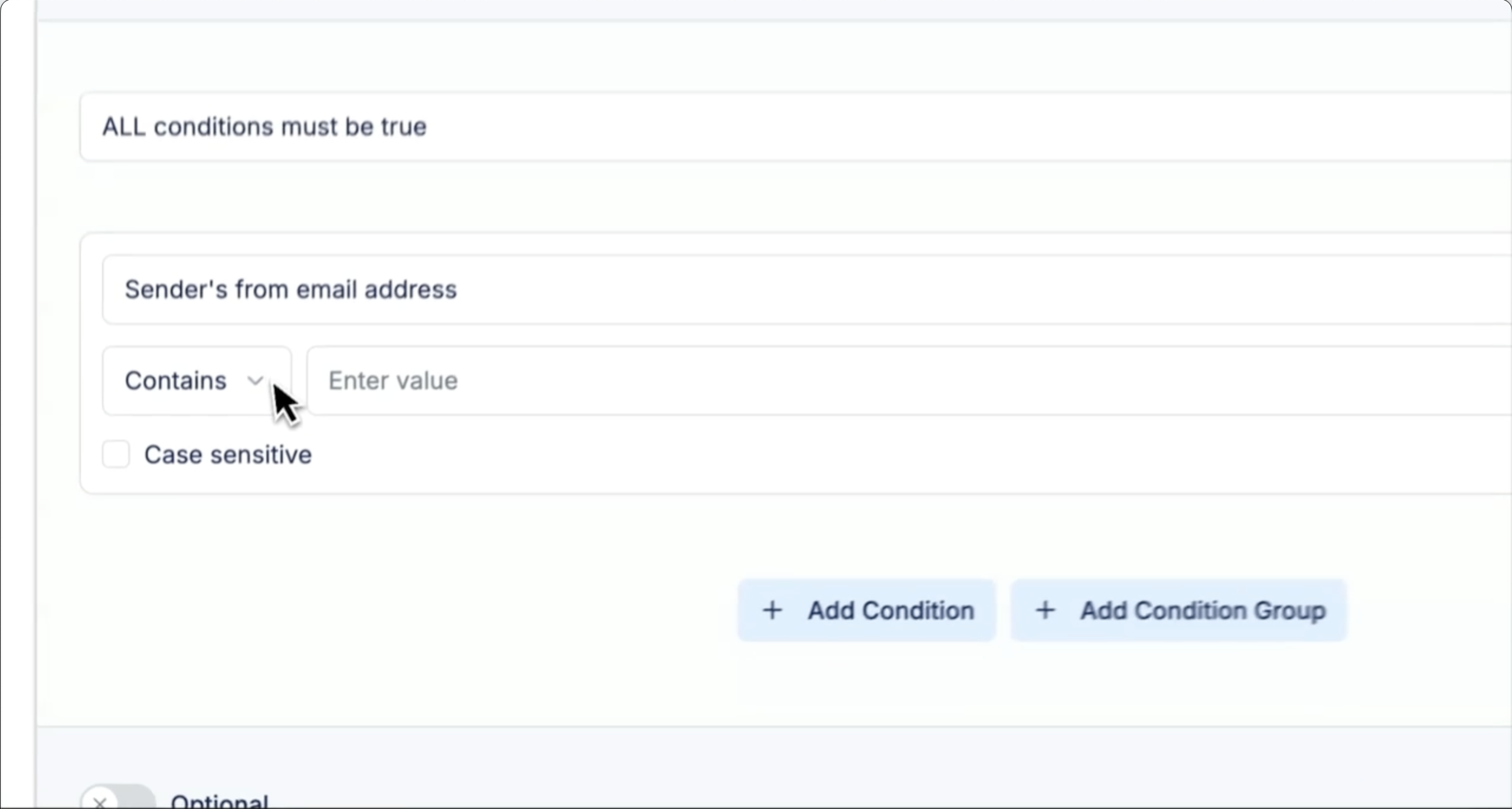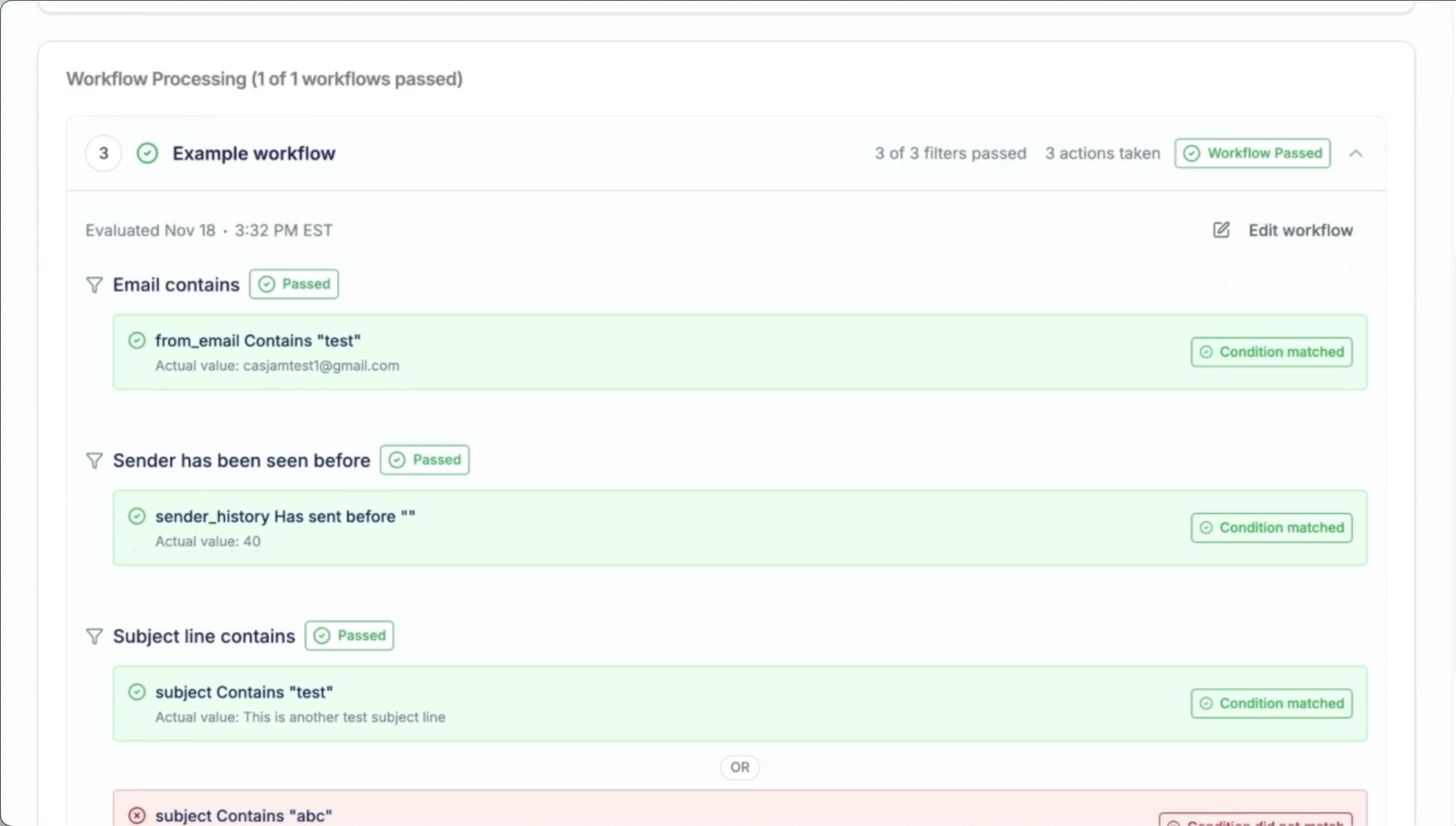 New emails are automatically processed through your workflows in real-time. Every email shows you the complete audit trail of what happened and why.